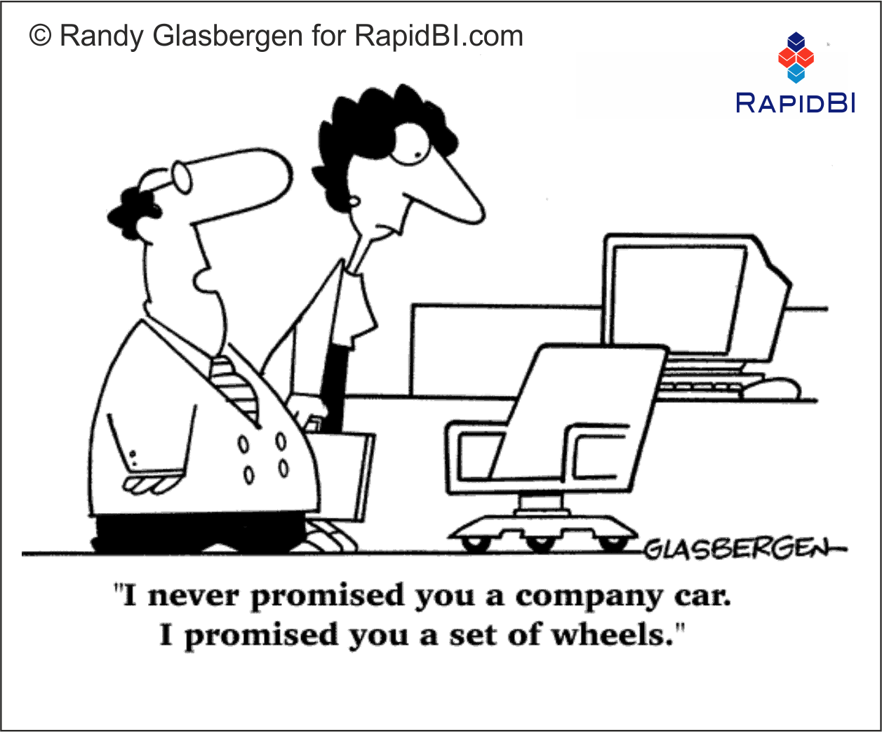 “I never promised you a company car. I promised you a set of wheels.”