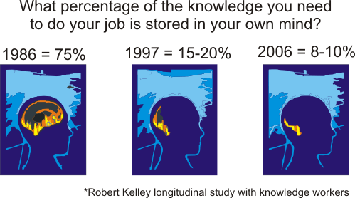 In this often quoted research, it is suggested that little of what we need on a day-to-day basis is required to be held in memory, and in this case there is a greatly reduced need for corporate training and development functions (in knowledge based environments). It was said that in 1986 75% of the knowledge we need to do a job is held in our brains, in 1997 that had dropped to 15-20%, and it was predicted that by 2006 it would be between 8 & 10%. It is interesting that for a so called longitudinal study that no update has been made for over 10 years.
